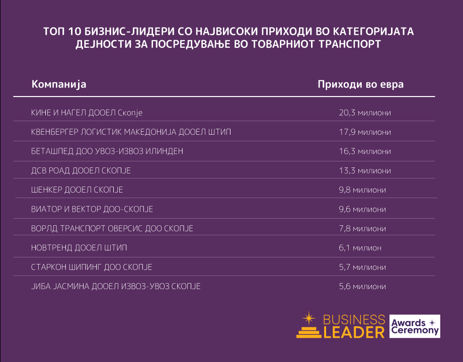 ТОП 10 БИЗНИС-ЛИДЕРИ СО НАЈВИСОКИ ПРИХОДИ ВО КАТЕГОРИЈАТА ДЕЈНОСТИ ЗА ПОСРЕДУВАЊЕ ВО ТОВАРНИОТ ТРАНСПОРТ