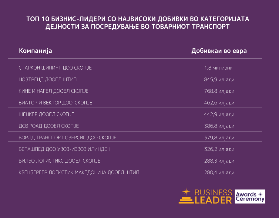 ТОП 10 БИЗНИС-ЛИДЕРИ СО НАЈВИСОКИ ДОБИВКИ ВО КАТЕГОРИЈАТА ДЕЈНОСТИ ЗА ПОСРЕДУВАЊЕ ВО ТОВАРНИОТ ТРАНСПОРТ
