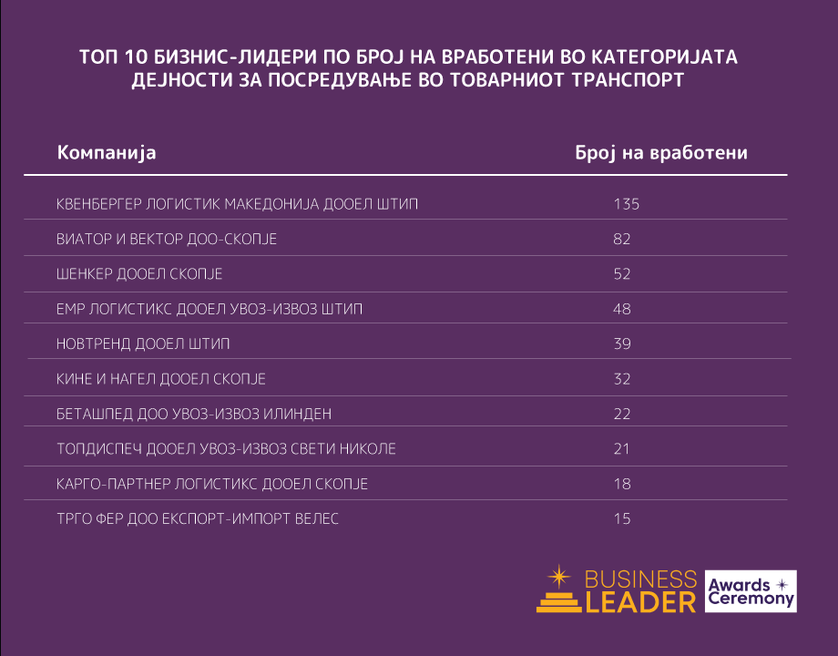 ТОП 10 БИЗНИС-ЛИДЕРИ ПО БРОЈ НА ВРАБОТЕНИ ВО КАТЕГОРИЈАТА ДЕЈНОСТИ ЗА ПОСРЕДУВАЊЕ ВО ТОВАРНИОТ ТРАНСПОРТ