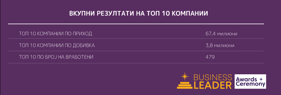 За позицијата на најдобрите 16 компании во оваа категорија, распоредени по десет според приход, добивка и човечки потенцијал, говорат бројките. ТОП десетте компании лани направиле промет од 67,4 милиони евра, чиста заработка од 3,8 милиони евра, а обезбедиле и плата за 479 лица. Тоа се бизнис-лидерите опфатени во оваа анализа која се базира на податоците од Бизнис Мрежа.