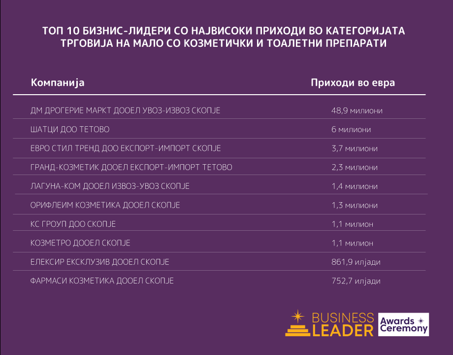 ТОП 10 БИЗНИС-ЛИДЕРИ СО НАЈВИСОКИ ПРИХОДИ ВО КАТЕГОРИЈАТА ТРГОВИЈА НА МАЛО CO КОЗМЕТИЧКИ И ТОАЛЕТНИ ПРЕПАРАТИ