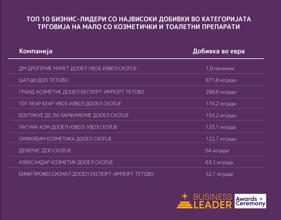 ТОП 10 БИЗНИС-ЛИДЕРИ СО НАЈВИСОКИ ДОБИВКИ ВО КАТЕГОРИЈАТА ТРГОВИЈА НА МАЛО CO КОЗМЕТИЧКИ И ТОАЛЕТНИ ПРЕПАРАТИ