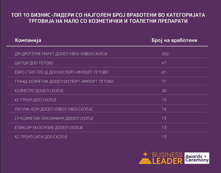 ТОП 10 БИЗНИС-ЛИДЕРИ СО НАЈГОЛЕМ БРОЈ ВРАБОТЕНИ ВО КАТЕГОРИЈАТА ТРГОВИЈА НА МАЛО CO КОЗМЕТИЧКИ И ТОАЛЕТНИ ПРЕПАРАТИ