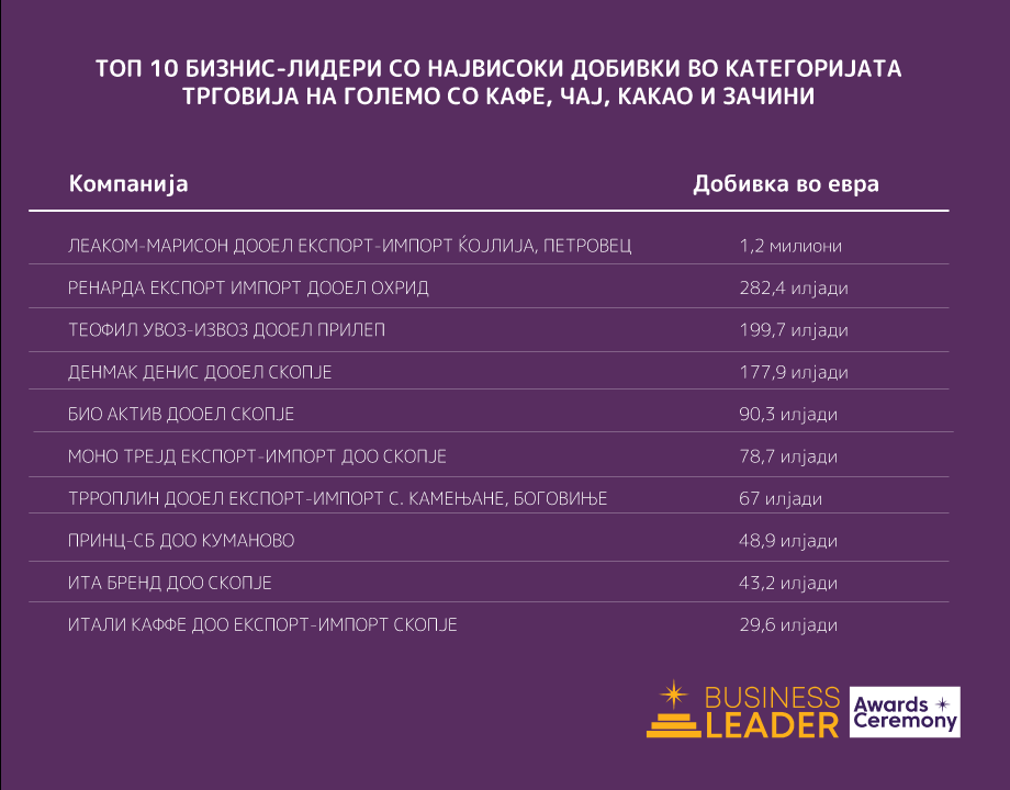 На трето место е кралот на какаото, ЛЕАКОМ–МАРИСОН од Ќојлија, Петровец со 5,5 милиони евра промет, компанија што успева да го најде својот простор меѓу големите. Интересно е што првите три компании генерираат речиси три четвртини од вкупните приходи на листата, пазар во кој широката дистрибуција и силното портфолио се рецепт за голем волумен.