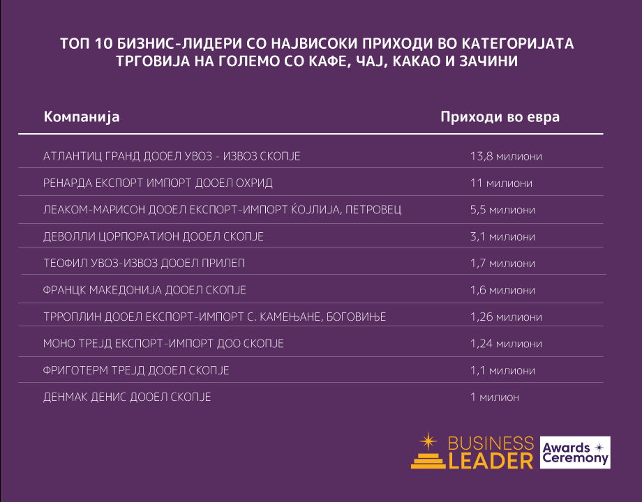 Ај, на кафе! Без тоа во Македонија не се може. Не сме Англичани, но и чајот, особено во зима, се троши. Зачините, пак, стануваат сè поприсутни на нашите трпези. Ова се одлични адути за успех во секторот трговија со кафе, какао, чај и зачини, кој лани заеднички завртил 41,3 милиони евра приход, создал 2,1 милиони евра добивка и бил дом на 153 вработени.
