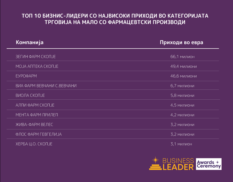 ТОП 10 БИЗНИС-ЛИДЕРИ СО НАЈВИСОКИ ПРИХОДИ ВО КАТЕГОРИЈАТА ТРГОВИЈА НА МАЛО СО ФАРМАЦЕВТСКИ ПРОИЗВОДИ