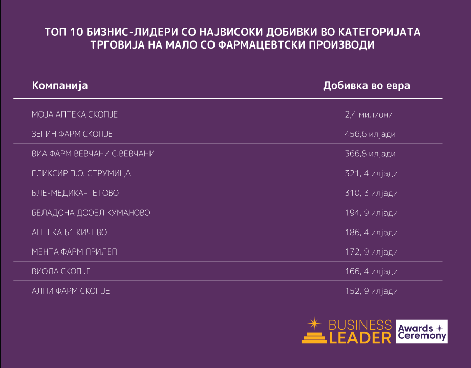 ТОП 10 БИЗНИС-ЛИДЕРИ СО НАЈВИСОКИ ДОБИВКИ ВО КАТЕГОРИЈАТА ТРГОВИЈА НА МАЛО СО ФАРМАЦЕВТСКИ ПРОИЗВОДИ