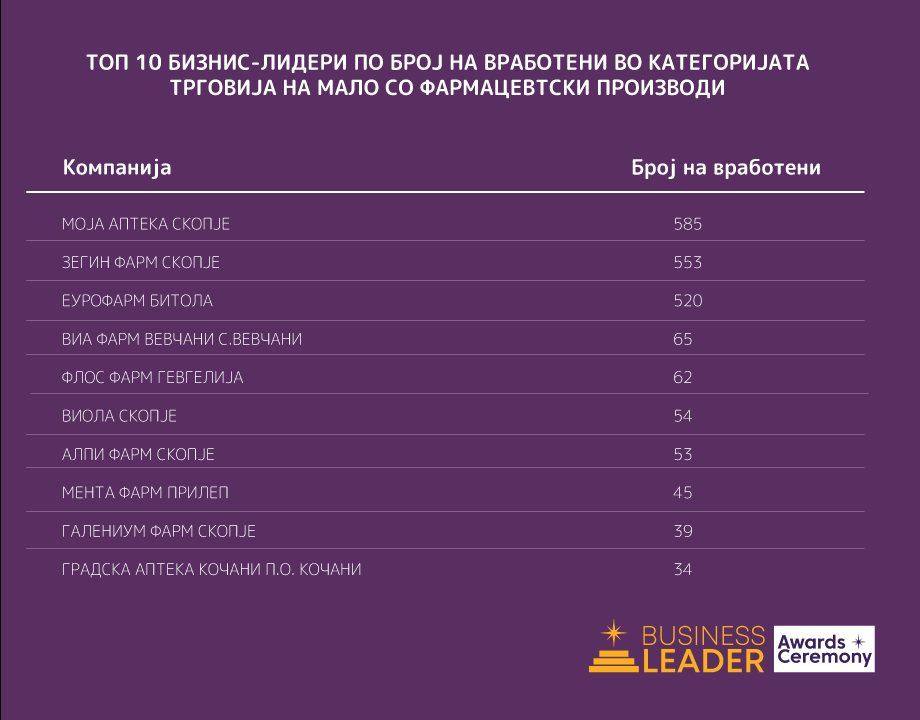 ТОП 10 БИЗНИС-ЛИДЕРИ ПО БРОЈ НА ВРАБОТЕНИ ВО КАТЕГОРИЈАТА ТРГОВИЈА НА МАЛО СО ФАРМАЦЕВТСКИ ПРОИЗВОДИ