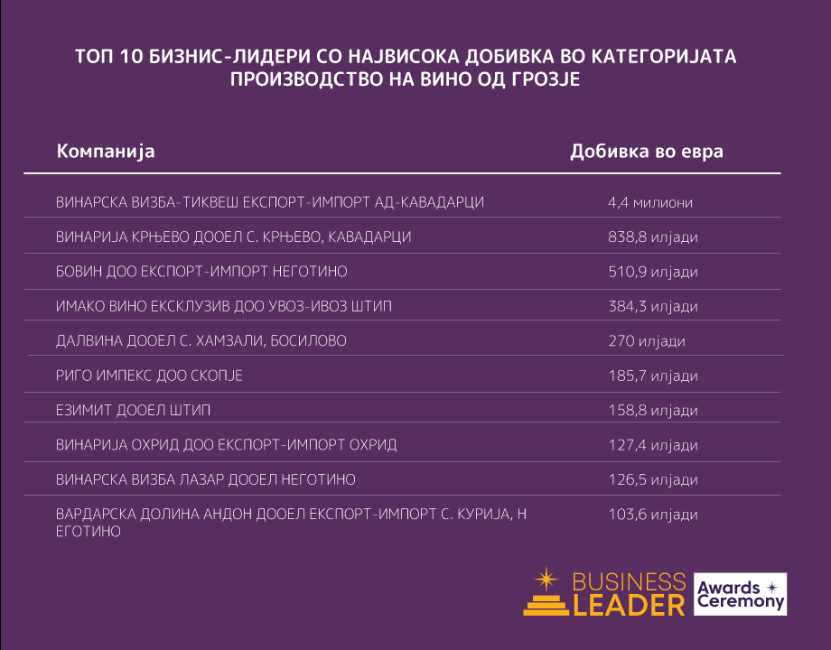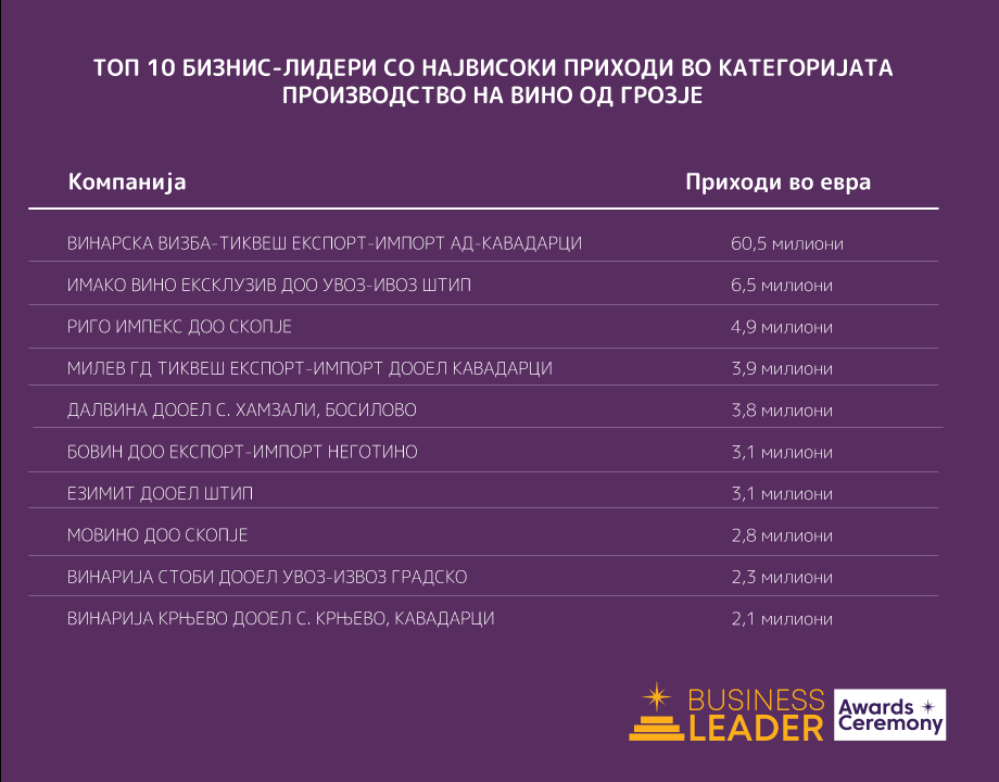 На шесто место на списокот е Бовин од Неготино, винарница со богато искуство, позната по своите премиум вина и меѓународни признанија, која оваа година остварила 3,1 милион евра приход.