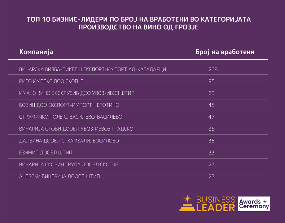 Бовин, Далвина и Стоби вработуваат меѓу 35 и 48 луѓе, а најмала по број на вработени е Аневски Винерија од Штип, со 23 лица. Иако бројките не се многу големи, сепак се клучни за локалната економија во регионите каде што се наоѓаат.